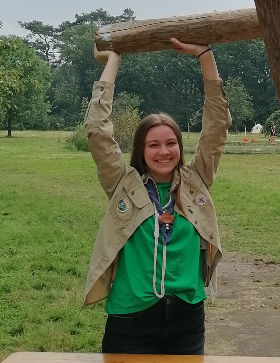 - Op je linkerarm komen je behaalde insignes en badges van evenementen (van de RSW (regionale scoutingwedstrijden of bijvoorbeeld van een labelterrein);